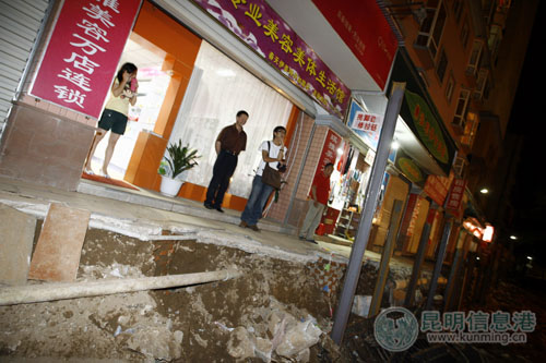 事發(fā)地段正處于王先生的裁縫店前。王先生回憶,沒有塌陷之前,人行道約有4米寬,中間有綠化帶,玉帶河堤邊上還有長(zhǎng)長(zhǎng)的鋼架護(hù)欄。施工以前這個(gè)路段就有裂縫,一開始呈分散狀態(tài),但到27日下午,門口的人行道開始“不動(dòng)聲色”地沉下去?!耙稽c(diǎn)聲音都沒有,就是緩緩地沉,直到1米高的護(hù)欄和地面持平,才停止塌陷。”