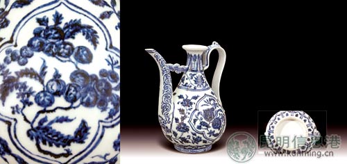 ????據(jù)云南典藏有關(guān)負(fù)責(zé)人介紹,拍賣“標(biāo)王”青花開光折枝花果紋執(zhí)壺通體施以白釉,釉質(zhì)青白透澈,肥潤晶瑩,青花發(fā)色翠藍(lán)深沉,局部有鐵銹斑,圖案為上等“蘇麻離青”鈷料所繪。從文物藝術(shù)品的收藏價(jià)值來看,執(zhí)壺整器端莊大氣,做工精湛,屬于明代永樂時(shí)期青花瓷中的代表之作。目前,除國內(nèi)外的文物館藏之外,同類器物能在國內(nèi)外市場上流通的可謂屈指可數(shù),很少見諸于市,因此也就更加彌足珍貴了。