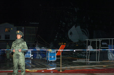 ????前晚,麗江市華坪縣2009首屆芒果文化節(jié)開幕式暨大型文藝演出遭暴雨襲擊被迫中止。演出舞臺燈光鋼架倒塌,造成4人受傷,多臺演出轉播設備受損。事故發(fā)生后,華坪縣委、縣政府立即啟動應急預案,公安干警和武警官兵迅速出動,現(xiàn)場8000余名來賓和觀眾被安全疏散。