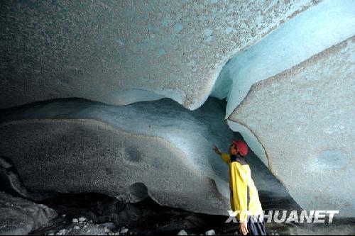 8月22日,中科院麗江玉龍雪山冰川與環(huán)境觀測站工作人員在海拔4800多米的地點(diǎn)觀測考察冰洞變化。新華社記者 秦晴 攝