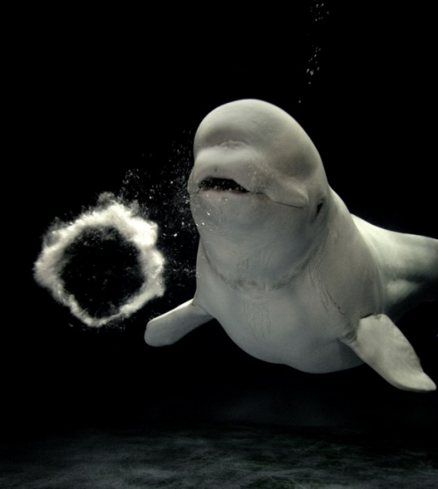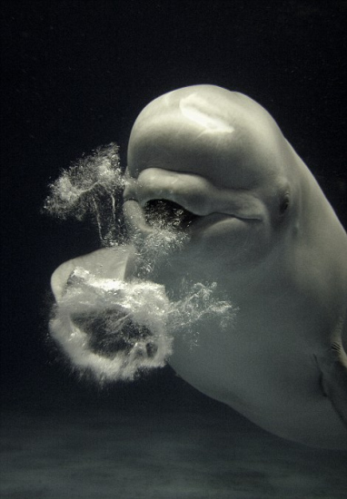 ????除了對(duì)吐泡泡情有獨(dú)鐘外,圖片中的這頭白鯨似乎對(duì)其它任何事情都毫無(wú)興趣。首先,它從氣孔噴出大量氣體,在水中形成一個(gè)甜甜圈狀的環(huán)形泡泡,而后在泡泡下方盡情翻轉(zhuǎn)身體,用鼻子尖親吻自己的作品又或者在上方滑行而過(guò)。給人的感覺(jué)是,這頭白鯨正在表演水下芭蕾。