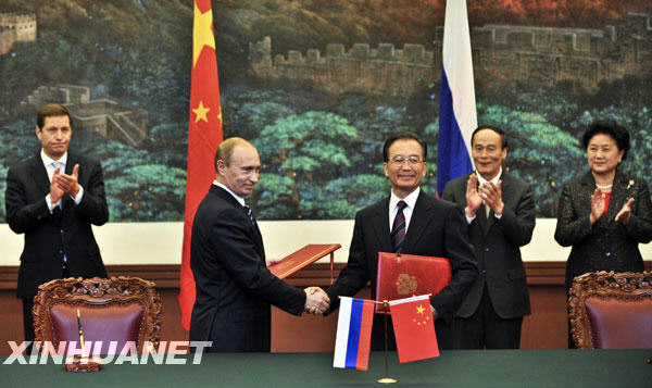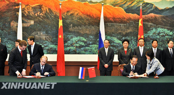 10月13日,國務(wù)院總理溫家寶與俄羅斯總理普京在北京人民大會堂簽署《中俄總理第十四次定期會晤聯(lián)合公報》。新華社記者謝環(huán)馳/攝