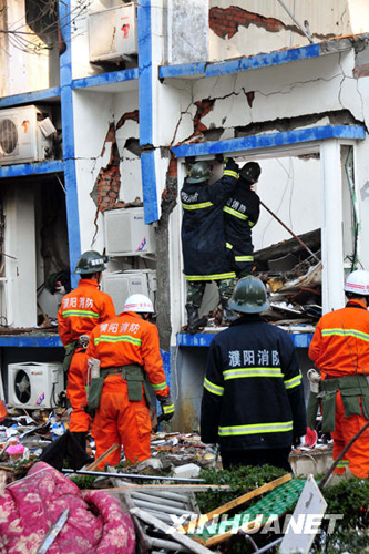 20日5時30分左右,濮陽市華龍區(qū)黃河路東段清華苑居民小區(qū)西區(qū)18號樓1單元2層東戶發(fā)生天然氣泄漏爆炸事故,造成二、三層樓體坍塌。5時33分,濮陽市消防支隊接到報警后,迅速調(diào)動華龍區(qū)、高新區(qū)、濮陽縣三個消防大隊及支隊機關(guān)13部消防車、95名消防官兵第一時間到達現(xiàn)場,進行滅火救人。