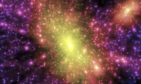 關(guān)于暗物質(zhì)的電腦模擬圖。該圖演示了不可見(jiàn)暗物質(zhì)是如何在光環(huán)中結(jié)合的。