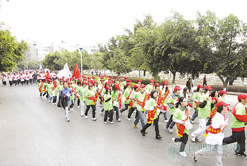????今天上午9點(diǎn),隨著起跑槍聲的響起,500名身著紅、黃、綠、白、粉不同顏色T恤的海鷗節(jié)志愿者從云南講武堂門口出發(fā),浩浩蕩蕩的晨跑隊(duì)伍吸引了許多到翠湖玩賞的游客駐足觀看。在翠湖上空飛翔的海鷗,此時(shí)也發(fā)出響亮的鳴叫,似乎在為健康跑隊(duì)伍歡呼。