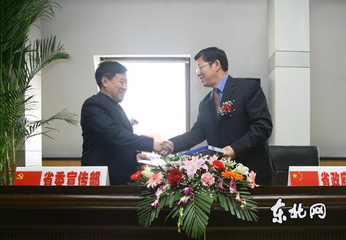 省委宣傳部副部長趙勤義(左)、省政府辦公廳副主任劉春林(右)代表雙方簽約。東北網(wǎng)記者 孫曉銳/攝