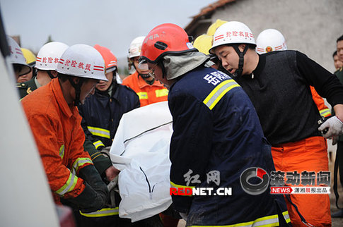 遇難消防官兵的遺體被救援人員抬出。圖/瀟湘晨報滾動新聞記者 秦樓