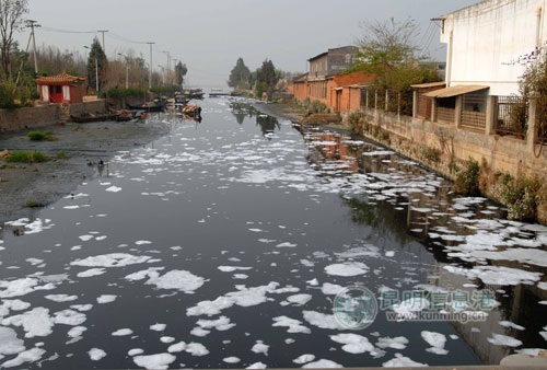??? 昨天,記者路過金家河入滇池河口前不到500米處一座小橋時,感到一陣惡臭撲鼻而來。順河上游看去,發(fā)現(xiàn)河面泛起大團大團的白沫。