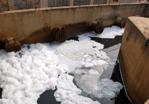 記者觀察發(fā)現(xiàn),金家河河水在金太塘處流經(jīng)一個泵站。經(jīng)過抽水、放水,產(chǎn)生了大量泡沫,幾乎占滿河面。厚厚一層泡沫越積越多后,便漏入滇池。這些散發(fā)惡臭的泡沫到底是怎樣產(chǎn)生的?據(jù)周邊住戶洪家小村的張姓村民介紹,金家河承擔著周邊地區(qū)、特別是沒有下水管網(wǎng)設(shè)施的農(nóng)村生活生產(chǎn)污水的排放。因為生活污水排入河道,有洗衣粉等殘余物質(zhì)而產(chǎn)生了泡沫。