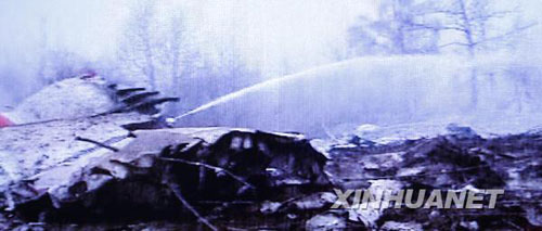 ????這張4月10日拍攝的電視截圖照片顯示,波蘭總統(tǒng)卡欽斯基乘坐的飛機(jī)在俄羅斯斯摩棱斯克機(jī)場墜毀的現(xiàn)場。新華社記者謝榮/攝