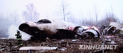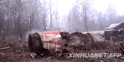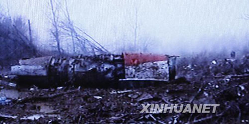 ????這張4月10日拍攝的電視截圖照片顯示,波蘭總統(tǒng)卡欽斯基乘坐的飛機(jī)在俄羅斯斯摩棱斯克機(jī)場墜毀后的現(xiàn)場。