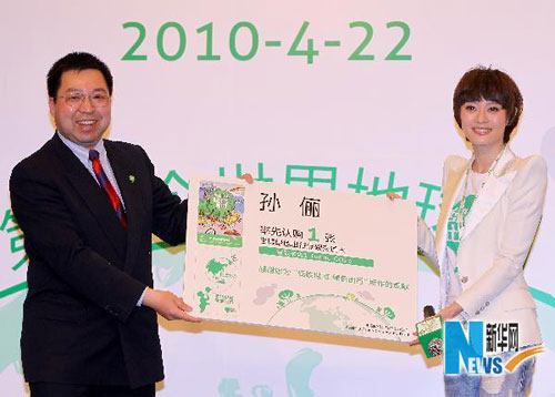 4月22日,演員孫儷(右)在“世博綠色出行低碳交通卡”首發(fā)儀式上認購首張“世博綠色出行低碳交通卡”。新華社記者 陳建力/攝