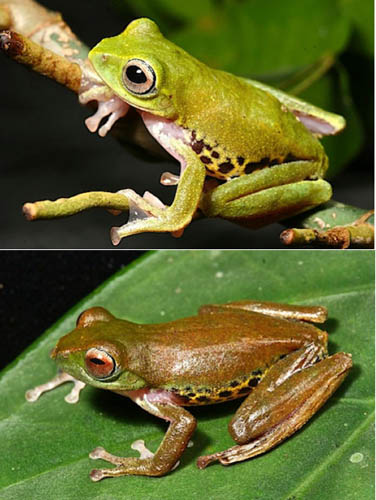 ????此外還有一種會變色的青蛙,也稱為飛天蛙。它們在夜晚的皮膚是綠色的,而白天則變成褐色的,而且眼睛的顏色也隨著皮膚顏色改變。它們當(dāng)然不能像鳥類那樣飛,只能能夠從在樹木間短距離滑翔。