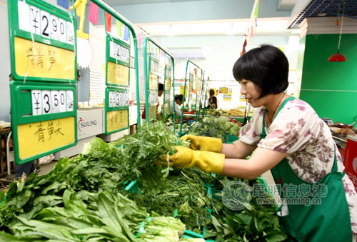 蔬菜超市的工作人員為菜架上菜。記者王俊星/攝