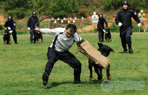 特警支隊(duì)現(xiàn)場(chǎng)演練,警犬死死咬住“歹徒”。記者杜文蕾攝