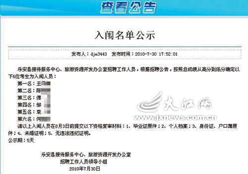 ????記者從樂安縣政府網(wǎng)站上的公示欄看到,7月30日有則“入圍名單公示”,入選者分別是:王某、陳某、傅某、鄒某、袁某和何某。