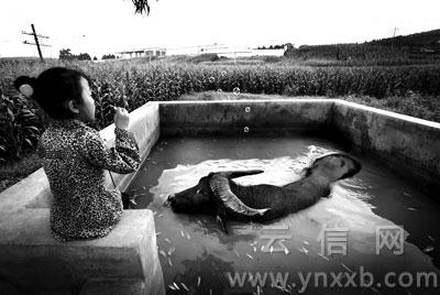????8月11日中午,路美邑村的天空碧藍如洗,石有平的兒子小寶牽著“擎天柱”走進澡塘。一見水,“擎天柱”便興奮起來,它連頭帶身沉進水下,悶了好一會兒才抬起頭緩緩呼出一口氣。“它是我兄弟,我每天都要帶它來泡澡,這是它最喜歡的游戲。”小寶邊說邊調皮地跳上牛背,“擎天柱”并不在意,仍舊愜意地享受著他美好的午后時光。
