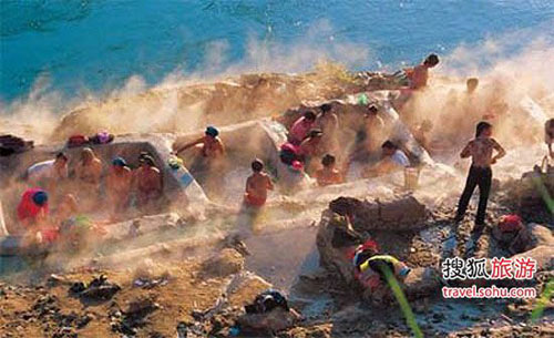 ????在怒江峽谷,最出名的民俗要數(shù)在春節(jié)期間舉行的“澡塘會”了。這是怒江地區(qū)的傈僳族一個獨具民族特色的傳統(tǒng)盛會,也是傈僳族的狂歡節(jié)。其每到春節(jié),從大年初二到初七,住在高山峽谷的傈僳人都背毯子或被子,并帶上米、肉、油、鹽、菜與炊具,相會在怒江邊有溫泉的地方,在那巖壁下或石洞里或石縫中輔上干草,弄開被子,開始了他們七天之“家”。他們一起開露天宴,泡溫泉,洗去污垢,舒展筋骨,并聚在一起談天說地,對歌跳舞。男男女女,老老少少相聚在這熱氣騰騰的溫泉中一邊搓洗,一邊說笑,嘻戲打鬧,好不熱鬧。