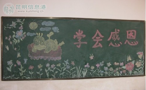 學(xué)生們?cè)诮淌业暮诎迳蠈?xiě)下“學(xué)會(huì)感恩”四個(gè)大字