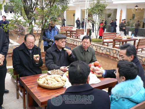 雖然當(dāng)天昭通下起了雨夾雪,但小寨鄉(xiāng)村民的熱情絲毫不減。村民們自發(fā)以當(dāng)?shù)靥赜械母栉栌訁柦淌谝恍械牡絹怼柦淌诤认铝水?dāng)?shù)厣贁?shù)民族同胞送上的熱茶,品嘗起農(nóng)家玉米。當(dāng)問起近年來的生活狀況時(shí),當(dāng)?shù)卮迕裾f,自從實(shí)施“整鄉(xiāng)推進(jìn)”項(xiàng)目以來,生活水平顯著提高了,通過經(jīng)營農(nóng)家樂,年收入能達(dá)到4至5萬元。