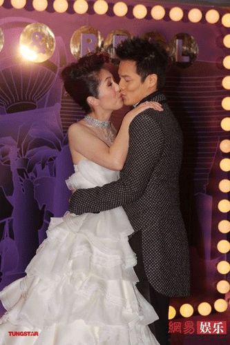 ????當(dāng)天下午四時(shí)許,一對新人楊千嬅與丁子高雙雙現(xiàn)身接受媒體采訪。身穿抹胸蛋糕型婚紗的楊千嬅顯得非常興奮,拍照時(shí)與丁子高重演電影《 完美嫁衣》海報(bào)的精彩一幕。而后二人又在媒體的要求下數(shù)度熱吻,博得全場歡呼。不過大喜日子里楊千嬅依舊不改“烈女”本色,過程中多次責(zé)怪丁子高踩臟了自己的婚紗裙,一對新人打情罵俏喜感十足。