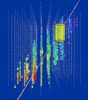 ????冰立方將會(huì)把南極μ介子及中微子探測器列陣(黃色圓柱體)團(tuán)團(tuán)圍住,后者是一個(gè)更小的中微子探測器。彩色斑點(diǎn)顯示的是通過冰立方陣列的中微子的路徑,這是由電子光學(xué)組件發(fā)現(xiàn)的。