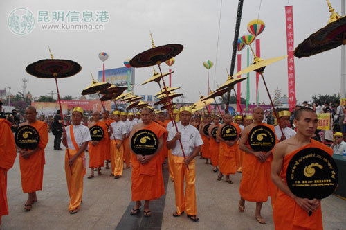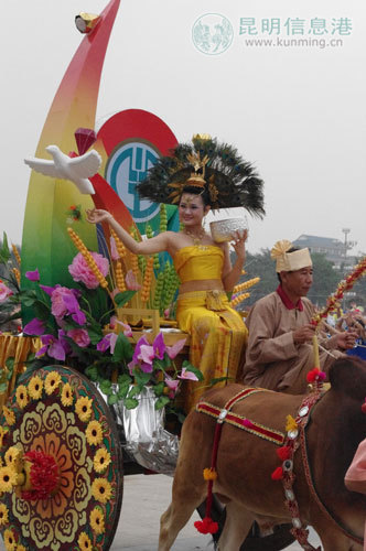 ????12日上午,在大德高僧領(lǐng)誦平安經(jīng)為民祈福的“浴佛誦經(jīng)”儀式后,廣場(chǎng)上身著艷麗民族服裝的舞隊(duì)和象腳鼓舞隊(duì)便走上舞臺(tái),在铓和象腳鼓的伴奏下翩翩起舞。在一片歡騰、熱烈的氣氛中,中國(guó)·德宏2011國(guó)際潑水狂歡節(jié)開(kāi)幕式隆重舉行。開(kāi)幕式演出既有充分展現(xiàn)傣族悠久的歷史和豐富的民俗文化的大型民族舞蹈表演,還上演了牛車(chē)與美女展演、千人象腳鼓齊鳴等精彩節(jié)目。