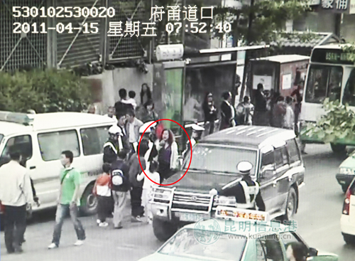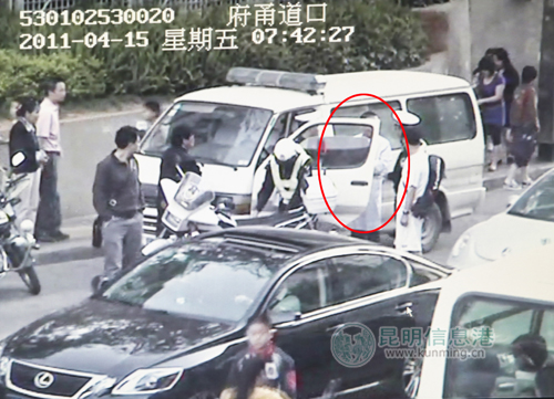 ????“救護車”是往文林街方向去的,在云師大附小門口,孫萌的同事楊峰正在那里值勤。簡單詢問了中年婦女的情況后,孫萌趕緊用對講機通知了楊峰,于是就出現(xiàn)了開頭的一幕,只是兩名“白大褂”跳車逃跑了。