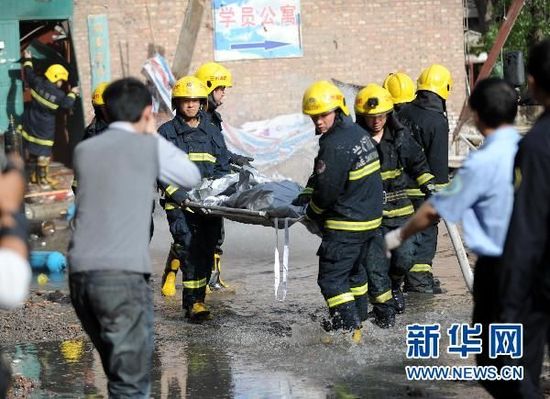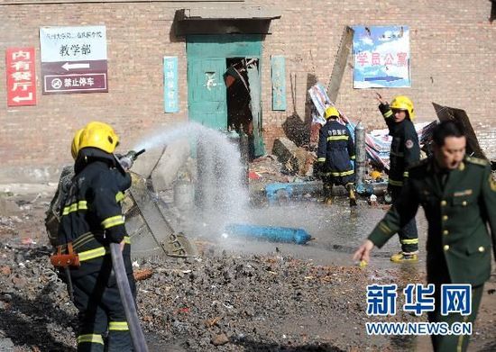 ??? 4月19日,蘭州市消防支隊特勤大隊消防人員在現(xiàn)場處理險情。當日下午16時20分許,蘭州大學第二附屬醫(yī)院一舊建筑拆除工地發(fā)生氣體瓶爆炸,造成2名施工人員當場死亡,7人受傷。聶建江/攝