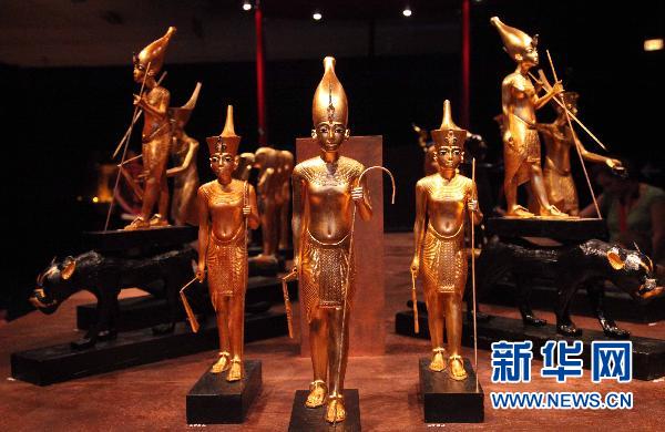 ????4月20日,比利時(shí)首都布魯塞爾展出古埃及法老圖坦卡蒙的隨葬金俑(復(fù)制品)。 新華社 記者王曉郡/攝