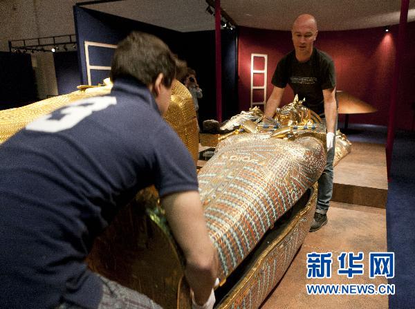 ????4月11日,在比利時(shí)首都布魯塞爾,工作人員搬運(yùn)埃及法老圖坦卡蒙棺木的復(fù)制品。新華社發(fā) 莫納斯/攝