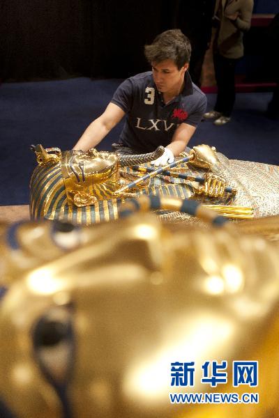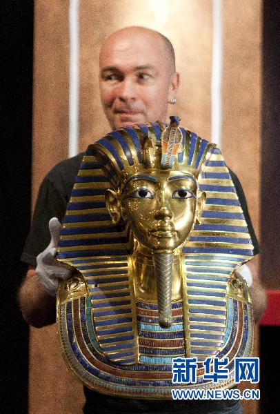 ????4月11日,在比利時(shí)首都布魯塞爾,工作人員擺放埃及法老圖坦卡蒙金面具的復(fù)制品。新華社發(fā) 莫納斯/攝