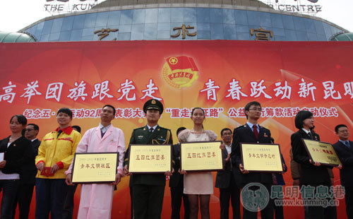 ????啟動儀式上,還舉行了昆明市五四表彰大會,來自全市各縣(市)區(qū)、個行業(yè)的近600名團員青年、青年志愿者和青聯(lián)委員代表參加了大會,其中,35個“五四紅旗團委”、49個“五四紅旗團支部”、68名“優(yōu)秀團干部”、96名“優(yōu)秀共青團員”在大會上受到表彰。