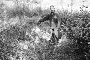 ????姜能山,熊家咀村原支部書記。昨日下午2點(diǎn),他帶著我們穿過村灣的小路,撥開兩旁的荊棘,不遠(yuǎn)處的山岡上,分布著一處無名墓群。