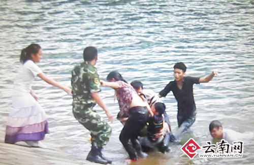 ????在思茅師專老師提供的這段長(zhǎng)2分17秒的視頻里,記者看到,3名小伙連推帶抱,將3名落水者救到了岸邊,隨后,又有一名身著軍裝的男子和3名女孩跑過來,將他們拉上了岸。上岸后,被救的3名落水者在大壩上停了一會(huì),而劉曉東從褲包里掏出手機(jī)不停甩水。
