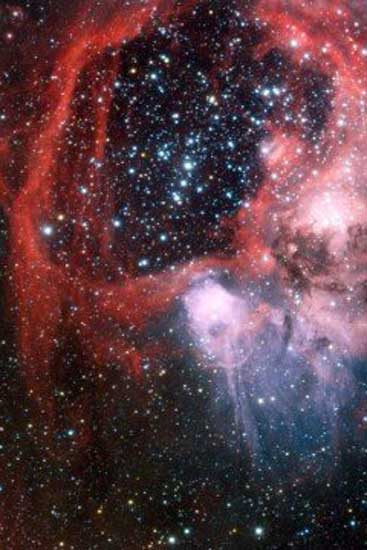 ????而天文學(xué)家之所以將這個宇宙空間中巨大的球形區(qū)域(LHA 120-N 44)冠以“超級泡泡”的名號,這是因為其占據(jù)大較大的一片宇宙空間,該天區(qū)跨度達(dá)325乘250光年,相比之下,我們太陽系到最近一個恒星的距離僅僅為4光年,可見其確實相當(dāng)?shù)佚嫶?。而這個宇宙泡泡形成的過程主要有這么兩個方面:首先,位于星團(tuán)中央的大質(zhì)量恒星擁有極高的溫度,這些恒星會形成強(qiáng)勁的帶電粒子流,以恒星風(fēng)的向外發(fā)射。由于該區(qū)域是恒星形成區(qū),所以聚集了大量的星際氣體,當(dāng)恒星結(jié)束其一生時,會以超新星爆發(fā)的形式終結(jié),爆發(fā)所產(chǎn)生的強(qiáng)大沖擊波又將這些氣體向外推,隨著時間的積累,逐漸形成這個超級宇宙泡泡奇觀。