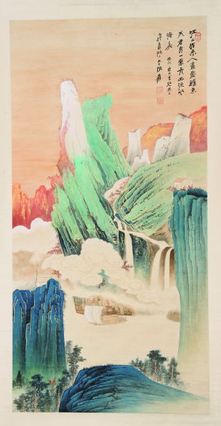 ????此《金碧山水圖軸》系張大千先生的精品代表作之一,他以宇宙之大、莫過我心的氣魄,運用大智慧,捕捉大感覺,抒寫大印象,營造大境界,追求大視覺,畫面山峰巍峨,直聳云端,山間白云浮動,嵐氣彌漫,飄逸俊美,整幅畫虛實相間,開合有度。險峻山峰用斧劈皴,以醒目的金粉做勾勒,金鉤鐵線,如刀劈斧削,全畫以群山列陣、壁立千仞的排山倒海之勢,營造大山大水大美之境界,整幅畫蒼深淵穆,天瀑空靈,雄偉瑰麗,氣勢磅礴,有如仙境,清逸絕塵,以雄渾暢達、浪漫精妙、神秘瑰麗的美學精神,為我們創(chuàng)造了人間仙境,畫中雄魂,令觀者震撼驚嘆不已。