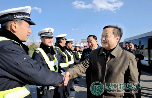 ????在新春佳節(jié)即將到來(lái)之際,1月21日下午,昆明市委副書(shū)記、市長(zhǎng)張祖林率隊(duì)對(duì)春運(yùn)安全工作進(jìn)行檢查,代表市委、市政府親切看望慰問(wèn)執(zhí)勤在一線交通民警,為全市公安交警送去了新年問(wèn)候和良好祝福。