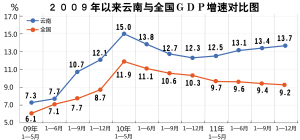 ????初步核算,2011年全省實(shí)現(xiàn)生產(chǎn)總值8750.95億元,比上年增長13.7%,比全國高4.5個(gè)百分點(diǎn),創(chuàng)近30年來云南省GDP增長的最好水平。