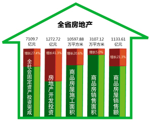 ????其中,房地產(chǎn)開發(fā)投資較快增長。2011年,全省房地產(chǎn)開發(fā)投資1272.72億元,比上年增長41.3%;比全省固定資產(chǎn)投資增幅高13.9個(gè)百分點(diǎn),占全省投資的比重由上年的16.3%上升至17.9%,對投資增長的貢獻(xiàn)率為23.5%,拉動(dòng)全省固定資產(chǎn)投資增長6.5個(gè)百分點(diǎn)。