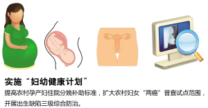 ????提高農村孕產婦住院分娩補助標準,擴大農村婦女“兩癌”普查試點范圍,開展出生缺陷三級綜合防治,降低孕產婦死亡率、嬰幼兒死亡率及新生兒出生缺陷率。