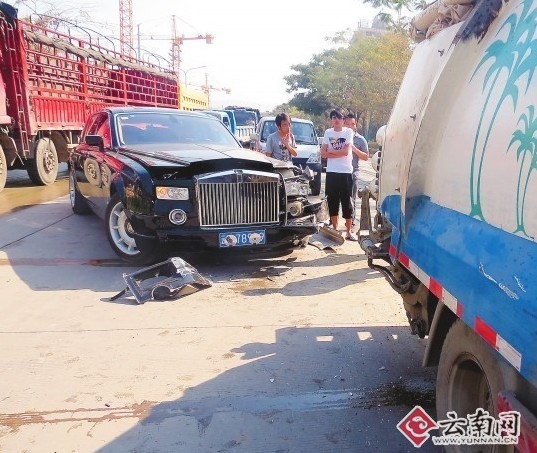 ????2月16日下午3點許,記者突然接到多名讀者打來報料電話,稱一輛勞斯萊斯在景洪市區(qū)的潑水廣場附近與垃圾車相撞。