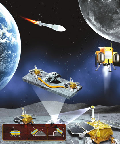 ????探月工程三期,月球車將對月壤采樣,然后裝回儲藏器,在無人的情況下在月球表面發(fā)射小火箭,并在月球軌道實現(xiàn)空間對接,最終將月壤樣品帶回地球