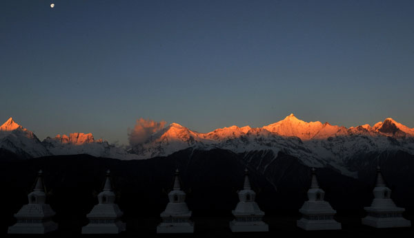 ????這是云南梅里雪山的“日照金山”奇觀。梅里雪山的山峰在太陽光的照射下如同一座座金山一般,此時月亮還沒有落山(3月12日攝)。新華社記者 儲學(xué)軍攝