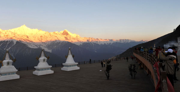 這是游客在云南梅里雪山前拍攝、觀看“日照金山”奇觀(3月12日攝)。新華社記者 藺以光攝