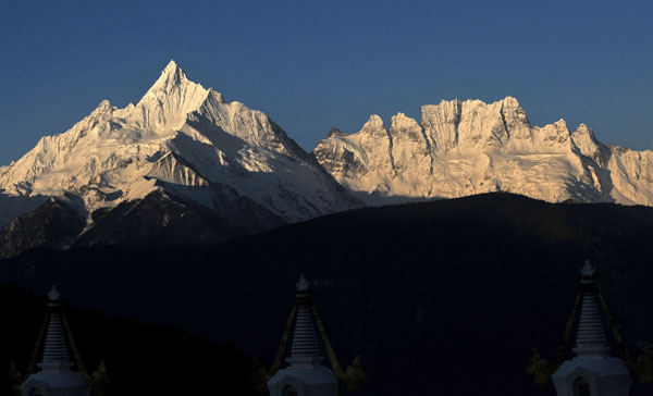 這是云南梅里雪山的緬茨姆峰(左)和加瓦仁安峰“沐浴”在清晨的陽光里(3月12日攝)。 新華社記者 藺以光攝