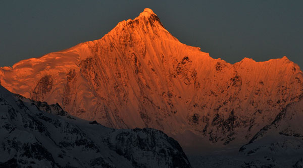 這是云南梅里雪山的“日照金山”奇觀。梅里雪山主峰卡瓦格博在太陽光的照射下如同一座金山般光芒萬丈(3月12日攝)。新華社記者 藺以光攝