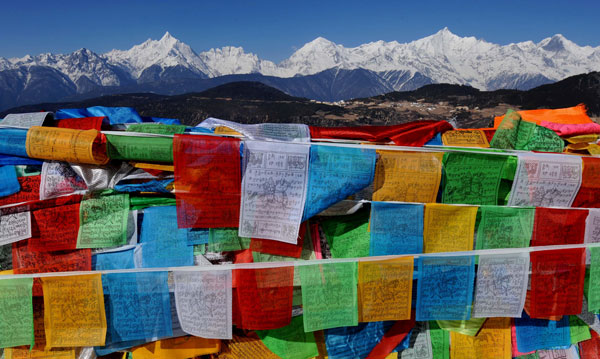 云南梅里雪山的群峰在五彩經(jīng)幡的映襯下十分美麗(3月12日攝)。 新華社記者 藺以光攝