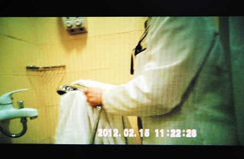 服務(wù)員“老師”的操作很熟練,可接下來她的動作卻讓記者看傻了--她把專用的抹布放在桶里涮了涮后就掛在了門上,轉(zhuǎn)身拿起客人用過的面巾擦拭起剛噴灑過清潔劑的面盆。