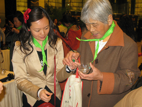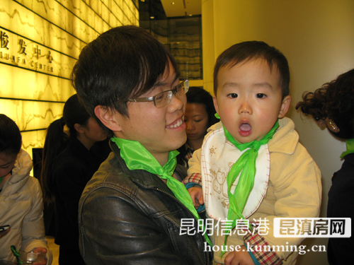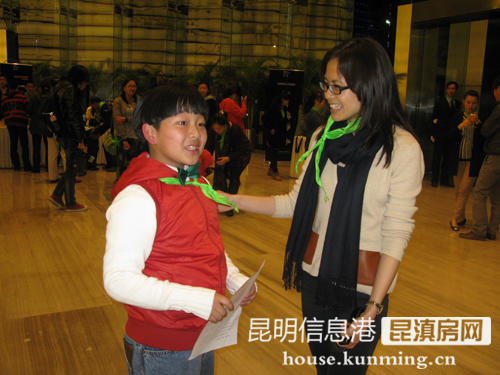 每個人都系上了一條象征綠色環(huán)保的綠色小領巾。圖為俊發(fā)地產(chǎn)品牌部經(jīng)理蔣文君和“每個人心中都有位環(huán)保家”的朗誦者趙啟辰小朋友。